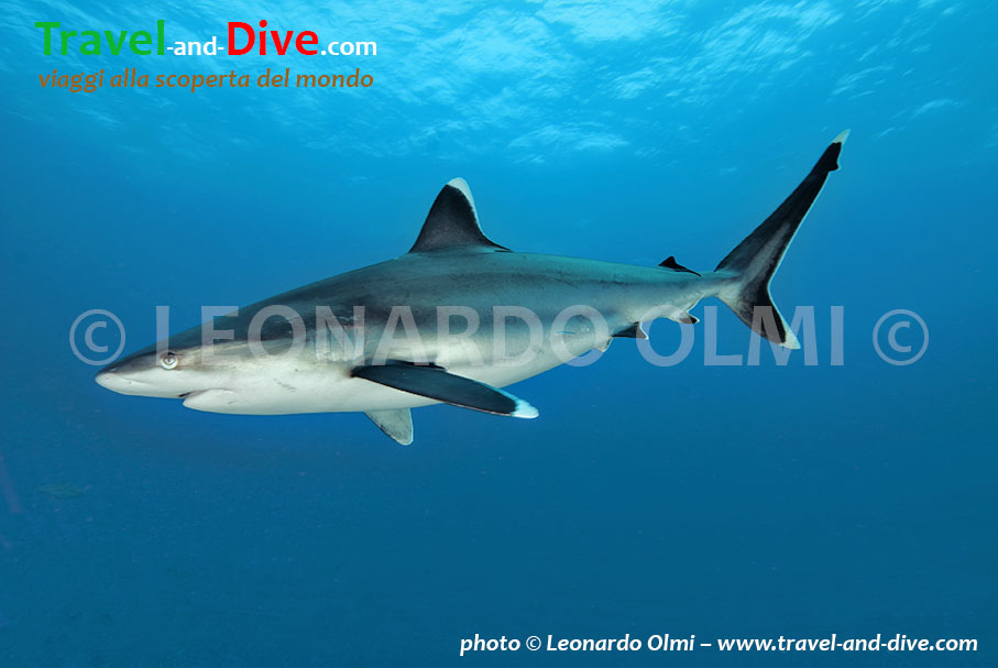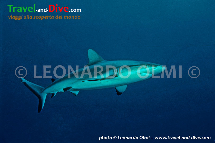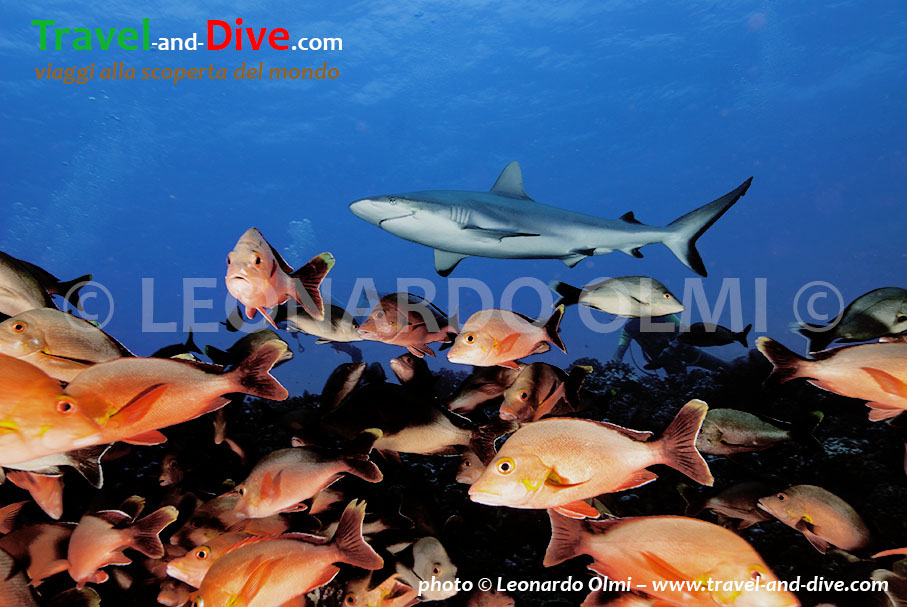 Il fondale degrada bruscamente nel blu, ma noi ci fermiamo intorno ai 28 metri dove il nostro divemaster ha nascosto dei tranci di pesce sotto ad un anfratto. Il sangue dovrebbe attirare un paio di specie diverse di squalo presenti nella zona non troppo comuni alle immersioni di altri mari, come il Silvertip (Charcharinus albimarginatus) e l’Oceanic Whitetip (Charcharinus longimanus).