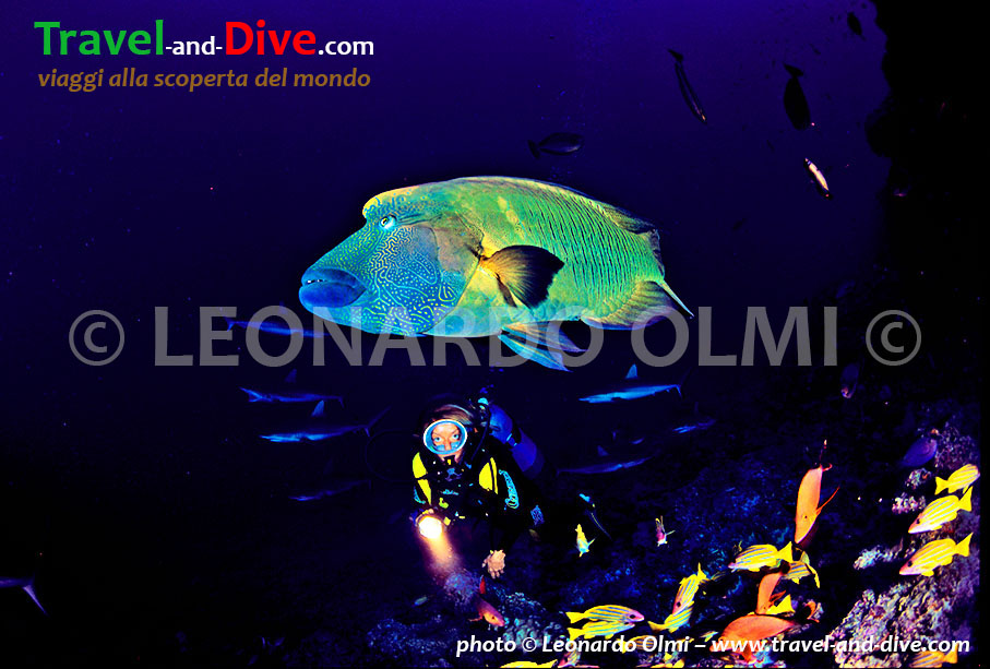 Al pasto si aggrega spesso anche un enorme Napoleone, alcuni balestra e altri pesci soldato che colorano ancor di più le nostre immagini. Dopo qualche minuto ci diamo un vero e proprio “pronti-via”, saltando fuori dalla grotta dove veniamo colpiti dal flusso di corrente che ci prende e ci trascina verso l’interno della pass. A questo punto ci stiamo veramente divertendo da matti.