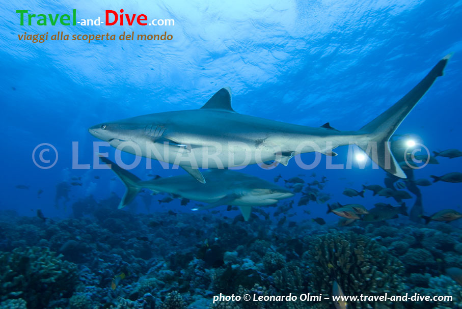 Una volta usciti dall’atollo, il gommone ci porta sul lato sinistro del reef esterno dove ci immergeremo trasportati dalla corrente fino ad incontrare una grotta intorno ai 30-35 metri di profondità. Riparati dalla corrente all’interno della grotta, assisteremo ad uno spettacolo incredibile, in breve tempo (ancora grazie a dei tranci di pesce nascosti sotto i coralli) saremo circondati da un branco di una trentina di squali grigi che sfiorano i nostri obbiettivi.